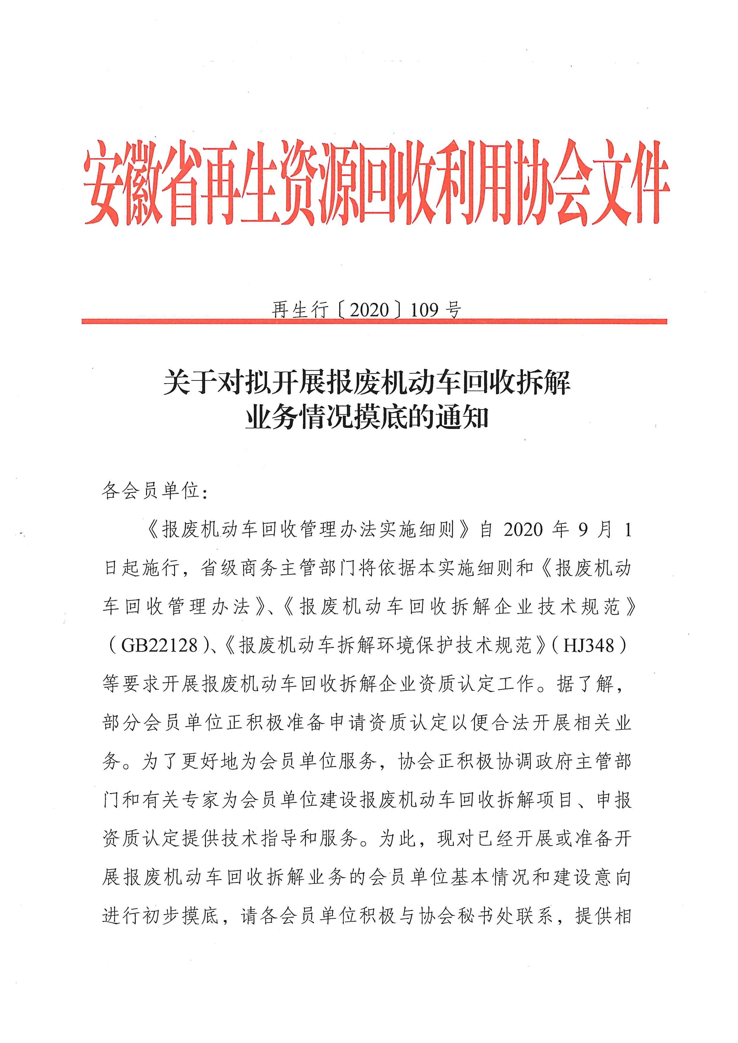 《報廢機(jī)動車回收管理辦法實施細(xì)則》自2020年9月1日起施行,省級商務(wù)主管部門將依據(jù)本實施細(xì)則和《報廢機(jī)動車回收管理辦法》、《報廢機(jī)動車回收拆解企業(yè)技術(shù)規(guī)范》(GB22128)、《報廢機(jī)動車拆解環(huán)境保護(hù)技術(shù)規(guī)范》(HJ348)等要求開展報廢機(jī)動車回收拆解企業(yè)資質(zhì)認(rèn)定工作。據(jù)了解,部分會員單位正積極準(zhǔn)備申請資質(zhì)認(rèn)定以便合法開展相關(guān)業(yè)務(wù)。為了更好地為會員單位服務(wù),協(xié)會正積極協(xié)調(diào)政府主管部門和有關(guān)專家為會員單位建設(shè)報廢機(jī)動車回收拆解項目、申報資質(zhì)認(rèn)定提供技術(shù)指導(dǎo)和服務(wù)。為此,現(xiàn)對已經(jīng)開展或準(zhǔn)備開展報廢機(jī)動車回收拆解業(yè)務(wù)的會員單位基本情況和建設(shè)意向進(jìn)行初步摸底,請各會員單位積極與協(xié)會秘書處聯(lián)系,提供相關(guān)情況和需求,協(xié)會將在認(rèn)真研究后制定下一步工作方案。