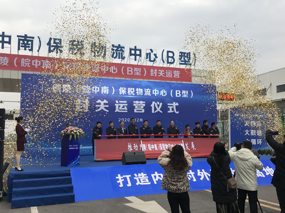 2020年12月23日上午9時,銅陵市政府組織開展銅陵(皖中南)保稅物流中心(B型)封關(guān)運營儀式,省商務(wù)廳副廳長朱丹、合肥海關(guān)副關(guān)長謝國柱;市委副書記趙振華、市人大常委會副主任葉萍、副市長吳強、市政協(xié)副主席鄭曉艷、銅陵經(jīng)開區(qū)管委會主任周劍等人參加儀式,東南公司作為銅陵市重要進出口企業(yè)應(yīng)邀出席。