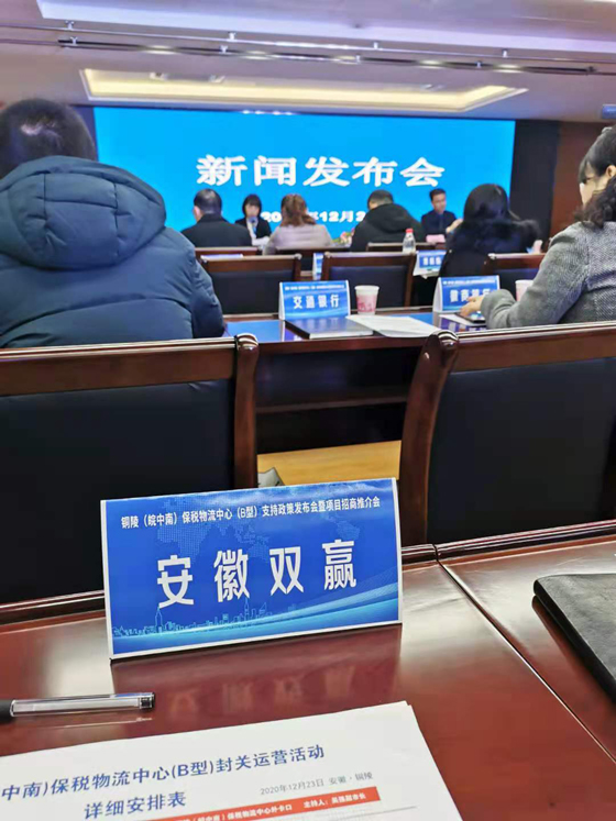 儀式結(jié)束后,銅陵市海關(guān)、稅務(wù)局、外管局等部門根據(jù)市政府《關(guān)于支持銅陵口岸集裝箱航運發(fā)展的獎補政策(試行)》規(guī)定聯(lián)合舉行銅陵(皖中南)保稅物流中心(B型)發(fā)展支持政策發(fā)布會暨項目招商推介會。