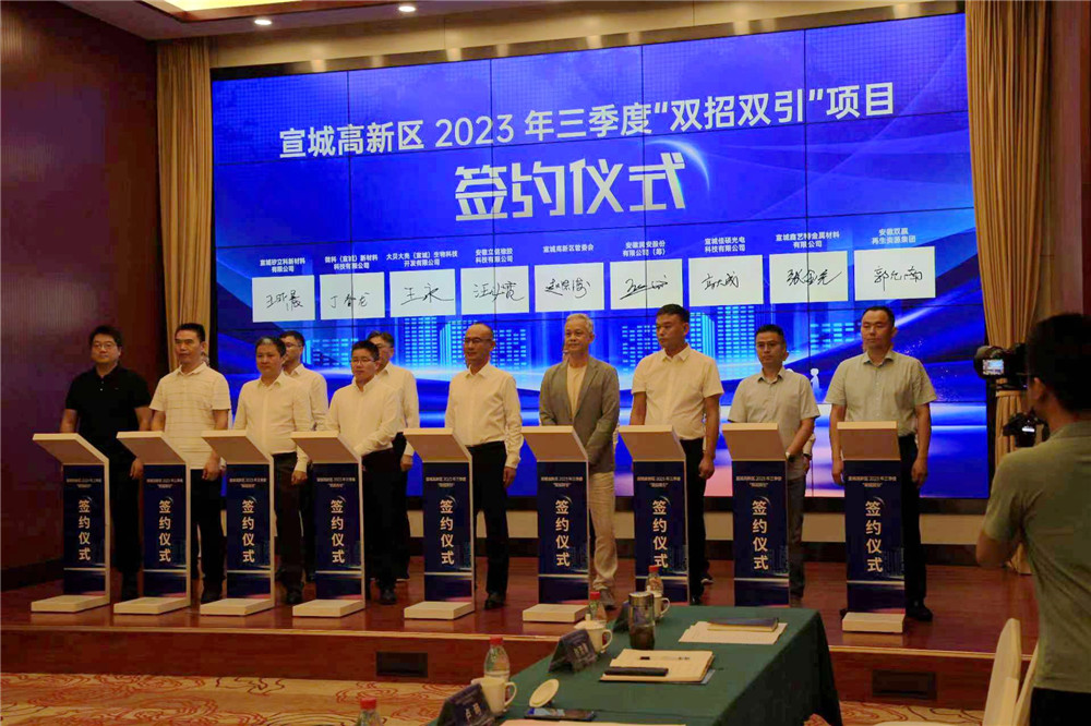 2023年9月7日上午,宣城高新區(qū)2023年三季度“雙招雙引”項目集中簽約儀式在高新區(qū)舉行。區(qū)委書記俞志剛出席并講話。區(qū)委副書記、區(qū)長王宏崢致辭。雙贏集團(tuán)宣城公司董事長、總經(jīng)理郭允南出席并代表宣城公司與高新區(qū)簽約“安徽雙贏集團(tuán)宣城公司綠色循環(huán)綜合體建設(shè)項目”。