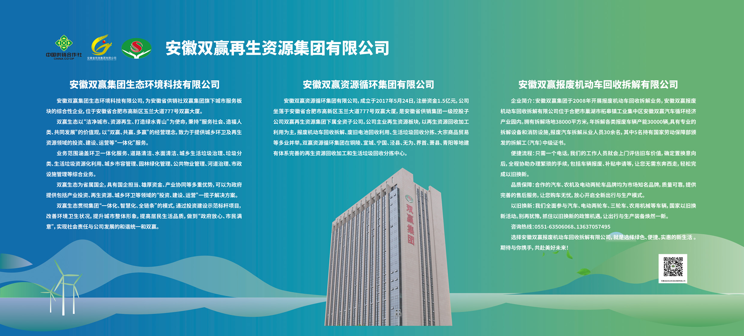 安徽雙贏資源循環(huán)集團(tuán)有限公司作為安徽雙贏集團(tuán)旗下的重要企業(yè),在年貨節(jié)上展示了其在資源循環(huán)利用的綠色發(fā)展理念。該公司以再生資源回收加工利用為主,報(bào)廢機(jī)動(dòng)車回收拆解、廢舊電池回收利用、生活垃圾回收分揀、大宗商品貿(mào)易等多業(yè)并舉并在銅陵、宣城、寧國(guó)、涇縣、無為、界首、蕭縣、青陽等地建有體系完善的再生資源回收加工和生活垃圾回收分揀中心,為推動(dòng)行業(yè)的綠色發(fā)展提供了有力支持。