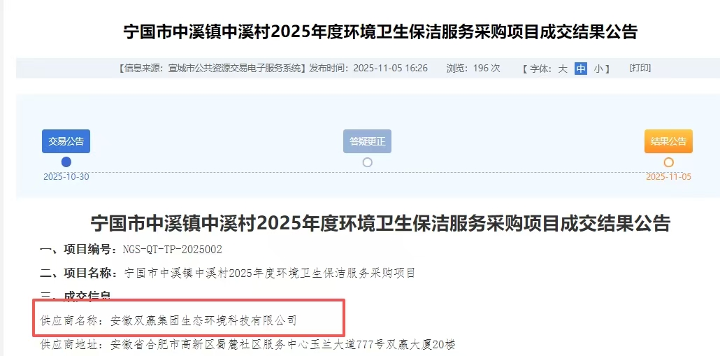 2025-11-06 安徽雙贏集團(tuán)生態(tài)環(huán)境科技有限公司中標(biāo)寧國(guó)市中溪環(huán)衛(wèi)項(xiàng)目